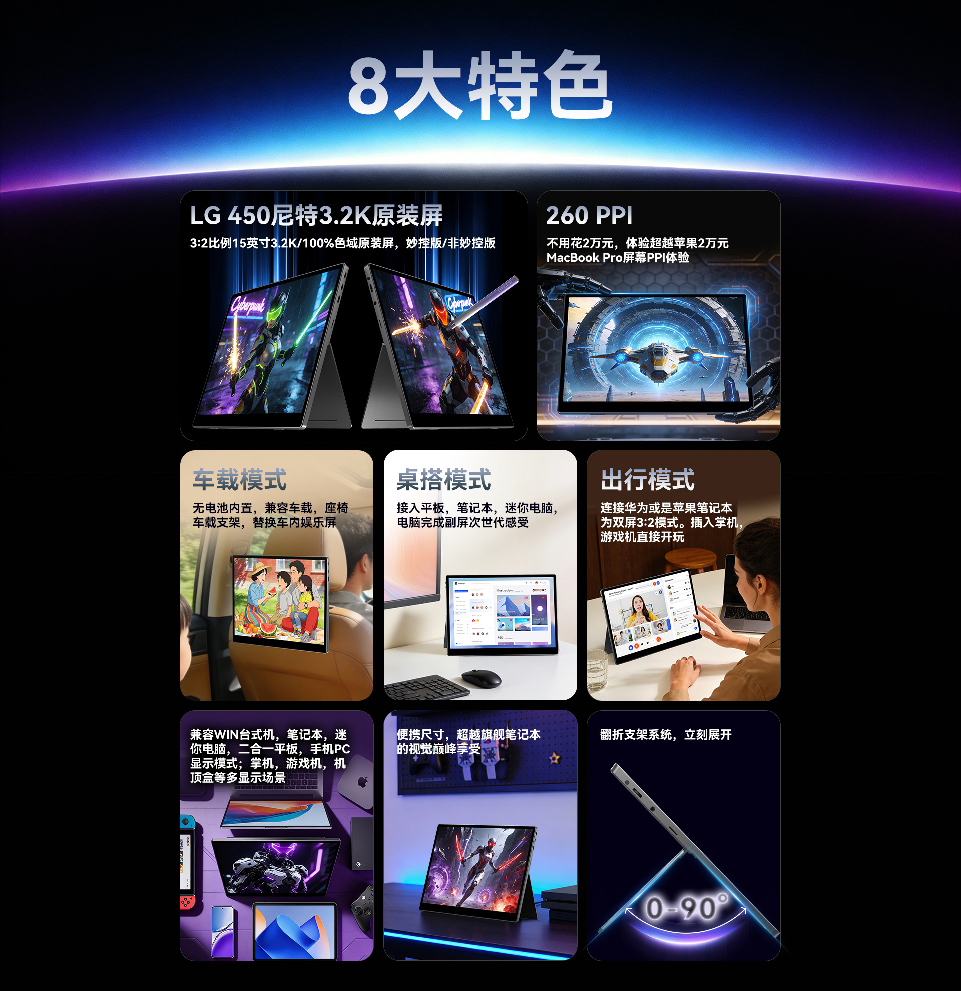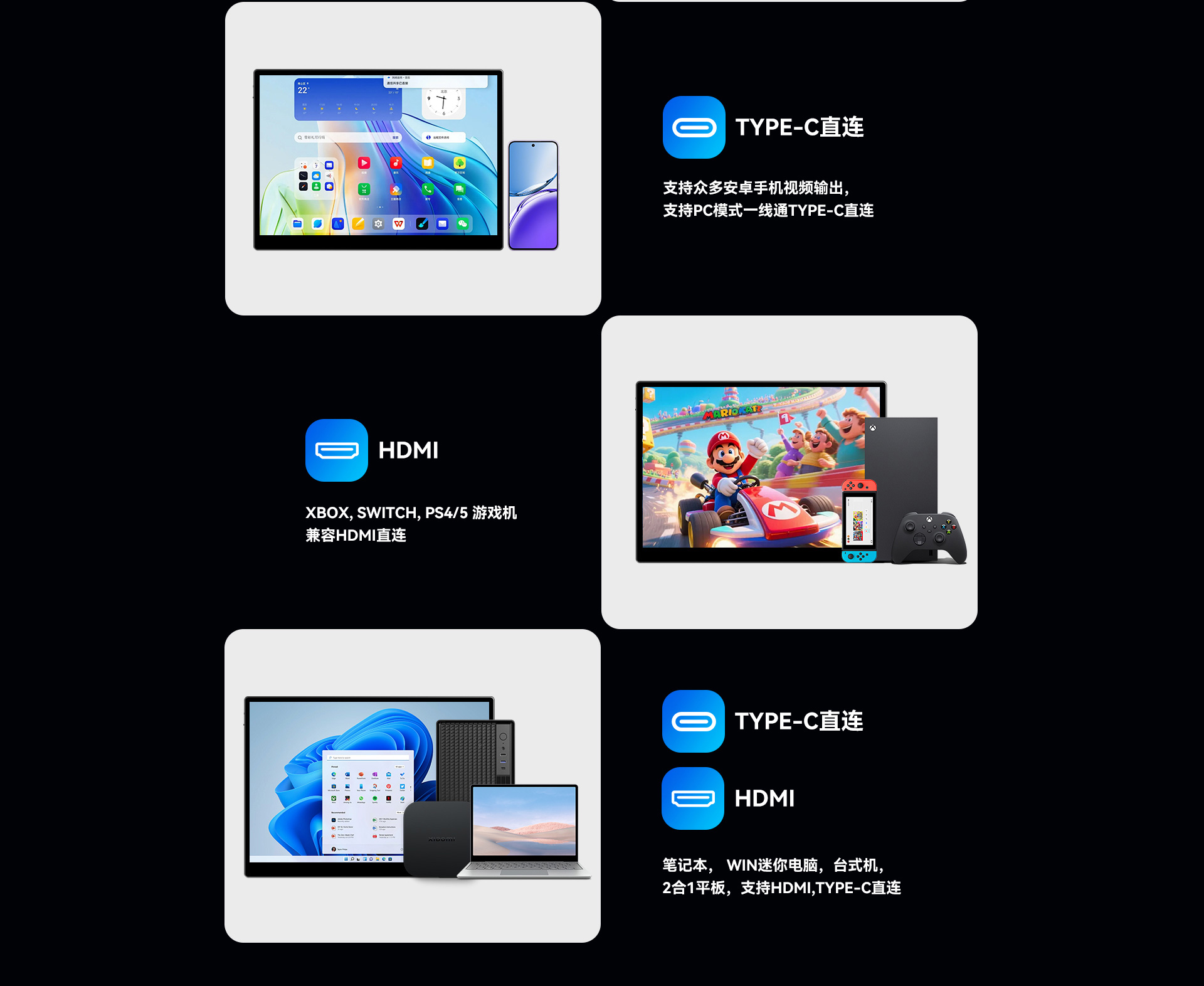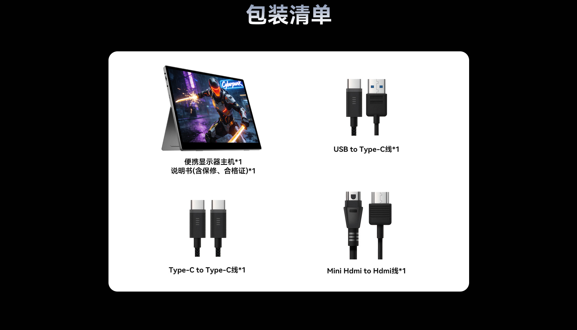 1*显示器主机,1*说明书(含保修、合格证),1*充电器,1*USB to Type-C线,1*Tpye-C to Type-C线,1*Mini Hdmi to Hdmi线